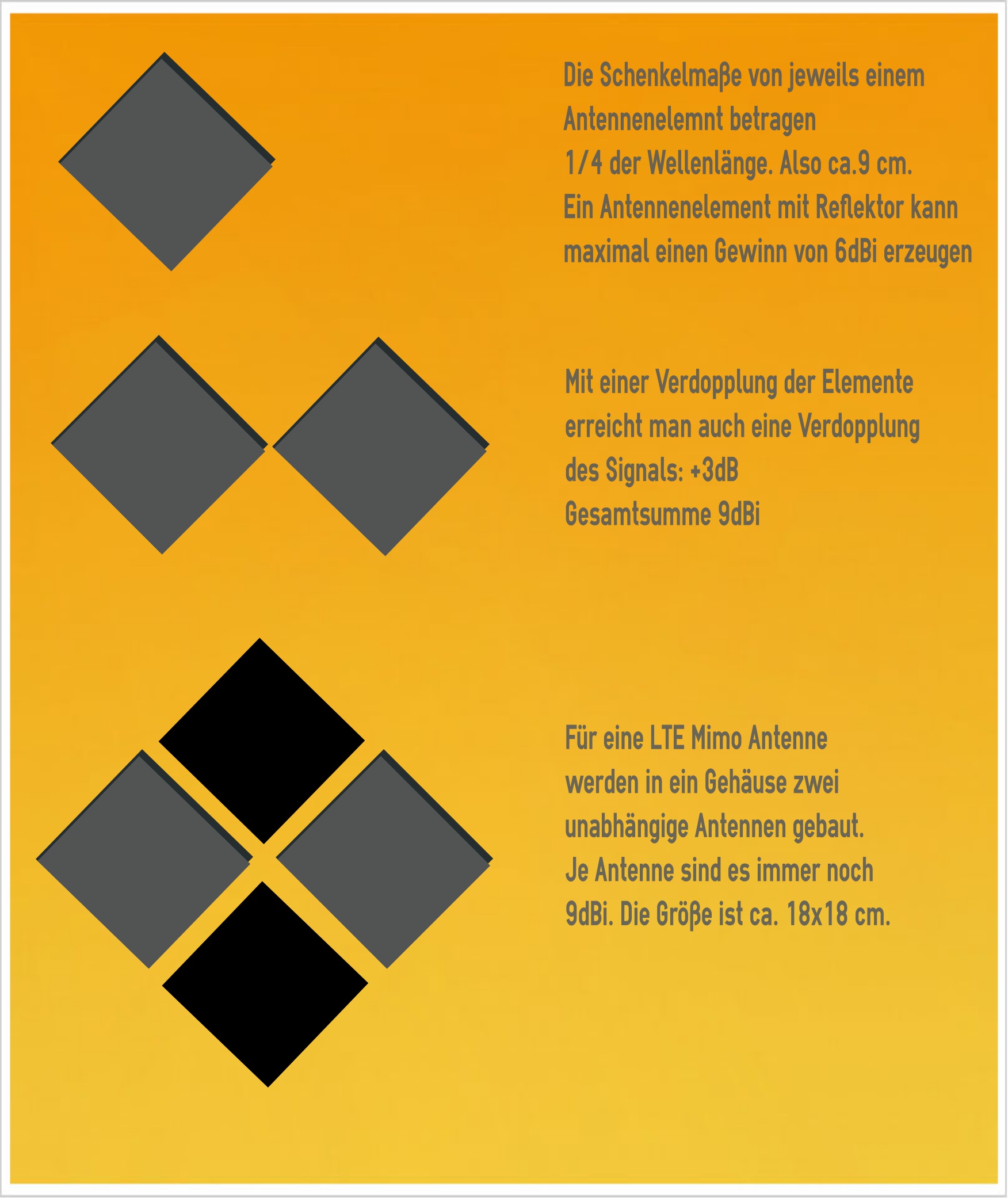 Wir wollen Ihnen verdeutlichen, dass für eine bestimmte Leistung und den damit verbundenen Gewinn einer Antenne auch eine klar definierte Größe notwendig ist. Dem entgegen werden z.B. bei Amazon Antennen angeboten, die zum einen mit einer Gehäusegröße von "nur 180 x 320 x 30 mm" beworben werden und zum anderen „einen satten Leistungsgewinn von 15 dBi“ versprechen. Es funktioniert einfach nicht. Mobilfunktechnik ist Physik - keine Magie!